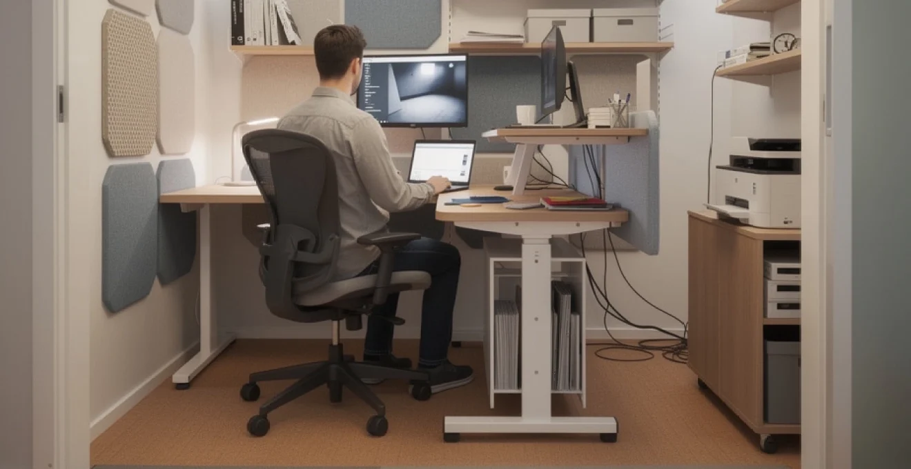 Un bureau de 5m2 amplifie naturellement les nuisances sonores : le moindre appel téléphonique, le passage dans le couloir ou le vrombissement d’une imprimante peuvent vite devenir envahissants. Plus le volume est réduit, plus le son rebondit sur les parois et crée une réverbération désagréable. Pour que votre micro-bureau reste un lieu propice à la concentration, il est donc indispensable de traiter l’acoustique avec autant de soin que le mobilier ou l’éclairage. La bonne nouvelle, c’est qu’un espace restreint nécessite relativement peu de matériaux pour obtenir un résultat perceptible.