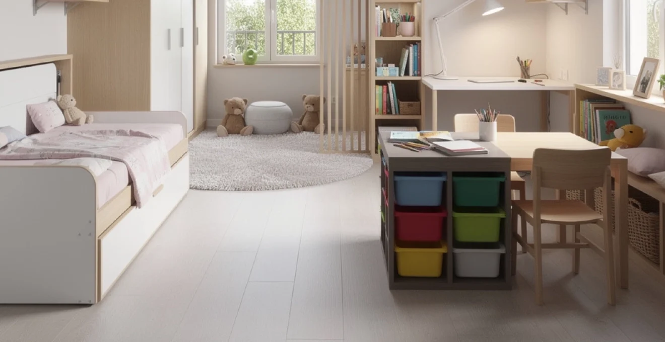 Une table à hauteur d’enfant, associée à une ou deux chaises légères, permet aux plus petits de s’installer et de se relever facilement. Sous la table ou juste à côté, des bacs sur roulettes accueilleront crayons, feuilles, blocs de construction ou figurines. Grâce à cette organisation, le passage d’une activité à une autre est plus fluide : « on s’assoit à la table pour créer, puis on range dans les bacs », ce qui limite la propagation du désordre dans toute la chambre.