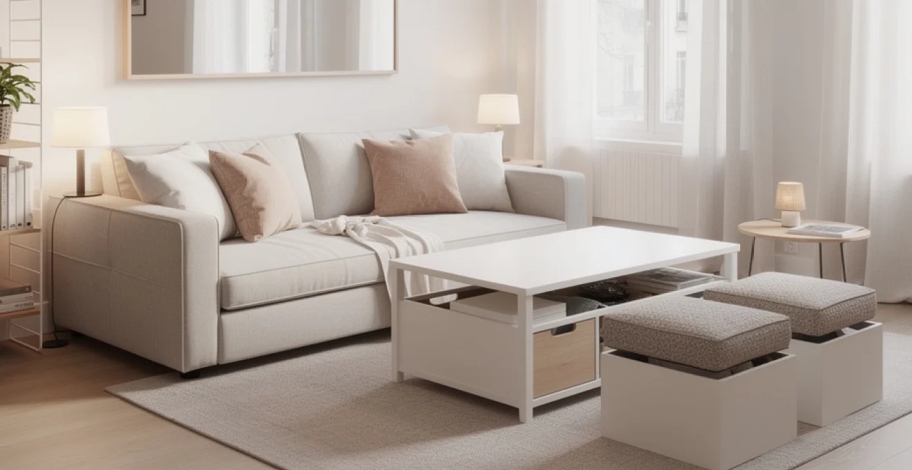 La clé consiste à penser votre salon comme une petite « boîte à outils » du quotidien : assise, couchage, repas, travail, détente. Comment intégrer toutes ces fonctions sans encombrer visuellement la pièce ? En privilégiant des meubles modulables, compacts et dotés de solutions de rangement intégrées, tout en exploitant la hauteur sous plafond grâce à des structures murales légères.